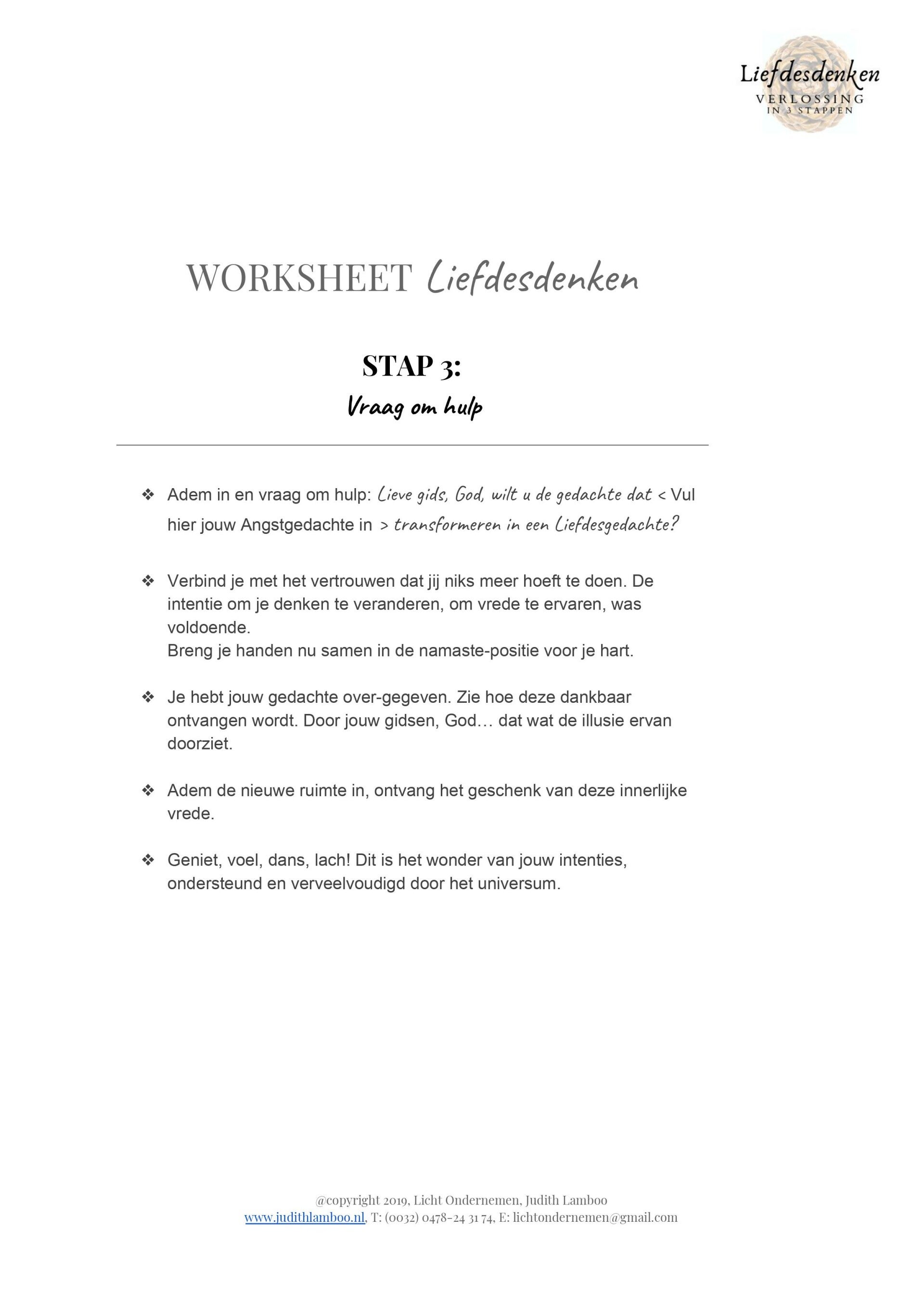 Deze worksheet is ook terug te vinden in de boeken 'Geluk in Liefde', 'Leef Licht' en de handleiding 'Liefdesdenken: Verlossing in 3 stappen'.